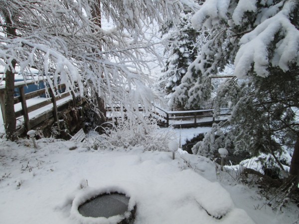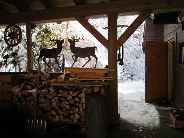 | |  | Blick vom Haus durch das Carport auf den Zufahrtsweg im Sommer... | | ... und im Winter schaut man vorbei an der Hautür... | | ... in den verschneiten Außenbereich. |