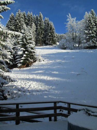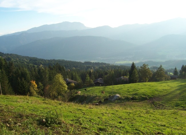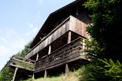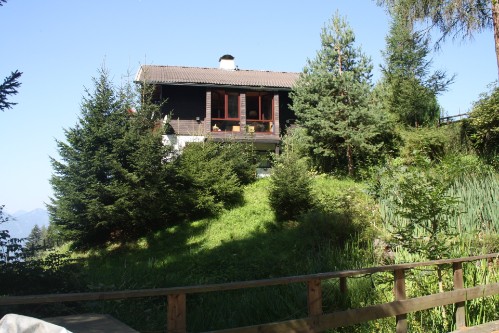 Beim Spaziergang hinauf auf die Almwiese... | | |  | |  | | | | | | ... sieht man das Dach der Almkirsche versteckt hinter der Lerche ganz links. | | Beim "Abstieg" hat man einen Blick auf das Außengelände. | | |