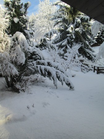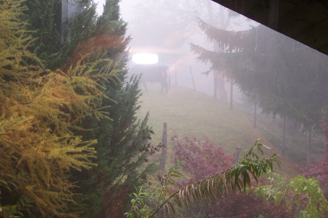 Blick aus dem Küchenfenster mit Kuh im Nebel...